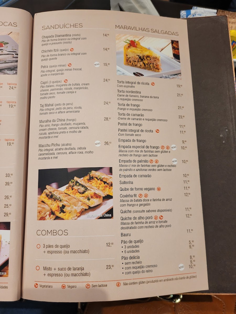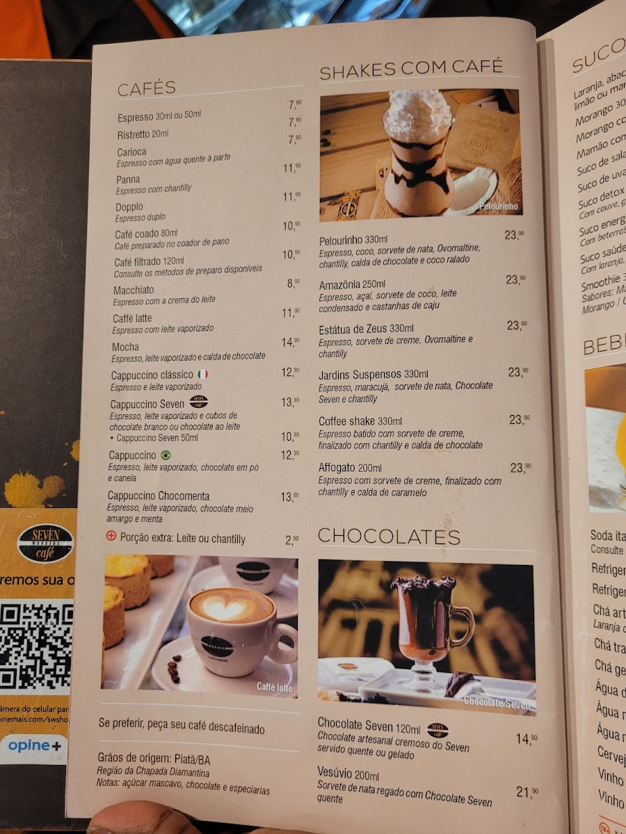 The menu at Seven Wonders Café feels like a carefully curated journey that balances comfort, creativity, and cultural variety, making it a strong closing impression after exploring each section in detail. The coffee selection anchors the experience, with classics like Café Expresso, Cafe Coado, and Cafe Filtrado delivering clean, well-defined flavors, while more elaborate creations such as Mocha, Chocolate Quente, Capucino br, Muralha da China E Capuccino, and Café Jardins Suspensos showcase a playful approach to presentation and taste. For those seeking something distinctive, Turkish Coffee stands out with its intense profile, and non-coffee options like Shake Amazônia and Chá Gelado de Gengibre add freshness and balance to the menu. Desserts play an equally important role, with Tiramisu offering a familiar, indulgent finish, while Torta de Ameixa brings a subtle sweetness that pairs naturally with the café’s beverages. The savory side of the menu broadens the experience beyond a typical café, highlighted by comforting Brazilian favorites such as Pão de Queijo and heartier dishes like Arroz de Costela, which adds depth and substance. The pies are particularly memorable: Torta de Camarão delivers rich, seafood-forward flavors, while Torta de Carne de Sol Com Banana da Terra successfully blends salty and sweet elements in a way that feels both bold and balanced. Taken together, the menu feels cohesive and thoughtfully designed, offering enough variety to satisfy quick coffee breaks, relaxed dessert moments, or even a more filling meal, all while maintaining a consistent identity that reflects care in both flavor and concept.